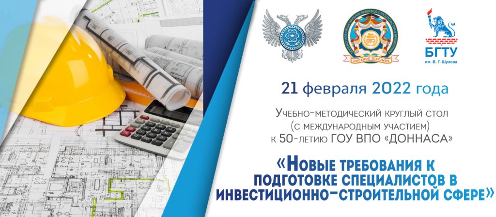 Приглашаем Вас принять участие в Учебно-методическом круглом столе (с международным участием) к 50-летию ГОУ ВПО «ДОННАСА» «Новые требования к подготовке специалистов в инвестиционно-строительной сфере», который состоится 21 февраля 2022 г.* на базе ГОУ ВПО «Донбасская национальная академия строительства и архитектуры» и ФГБОУ ВО «Белгородский технологический университет им. В.Г. Шухова».