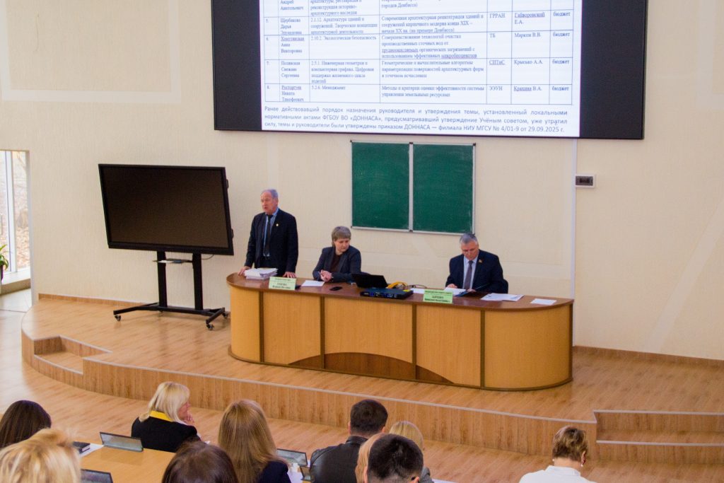 Директор управления научных исследований ДОННАСА – филиала НИУ МГСУ Владимир Филиппович Мущанов выступил с докладом по теме «Об утверждении тем аспирантов, соискателей и докторантов 1-го года обучения». Он напомнил присутствующим, что защита кандидатских и докторских диссертаций – ответственная задача, требующая чёткого соблюдения сроков, а количество остепенённых преподавателей – важный индикатор качества образования в учебном заведении и показатель для аккредитации вузов, их рейтинга и престижа.