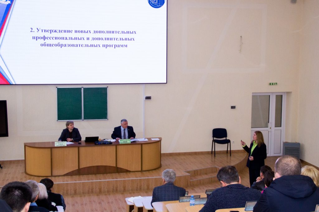 Дополняя этот доклад, директор Управления дополнительного образования Наталья Александровна Пушкарёва рассказала о регуляции стоимости обучения по программам дополнительного образования, переподготовки, повышения квалификации специалистов, а также подготовительных курсов, проводимых в ДОННАСА. Многие программы претерпели изменения в соответствии с новыми стандартами. Наталья Александровна также подчеркнула, что одним из важных требований к техническим вузам является подготовка и переподготовка специалистов по рабочим профессиям. Такая программа дополнительного образования в академии тоже есть.