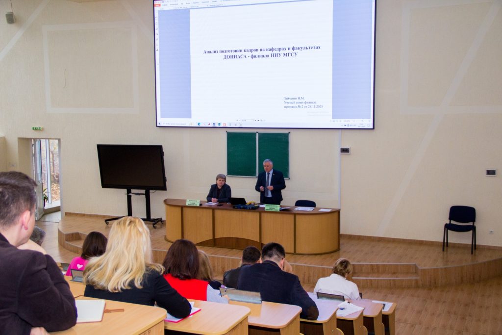 Директор ДОННАСА – филиала НИУ МГСУ, председатель Учёного совета академии Николай Михайлович Зайченко выступил с докладом «Анализ подготовки кадров на кафедрах и факультетах ДОННАСА – филиала НИУ МГСУ». Он подробно рассказал о состоянии кадровой базы академии, о нюансах каждого факультета и направлений подготовки. Директор отметил, что потребность в молодых высококвалифицированных кадрах, желательно таких, которые будут строить не только педагогическую, но и научную карьеру, очень высока: ведь, как уже было сказано ранее, в России делается особый акцент на омолаживание научного кадрового потенциала нашей страны. Этот вопрос обсуждался в неразрывной связке с фактом вливания академии в состав НИУ МГСУ. Это касалось, например, вопроса закрытия местных диссоветов и грядущих защит на базе нашего головного вуза. До деканов факультетов и заведующих кафедрами были также доведены сведения о необходимости внесения изменений в учебные планы и корректировок учебной нагрузки, а также сроки решения этих задач в соответствии с организационными требованиями Московского государственного строительного университета.