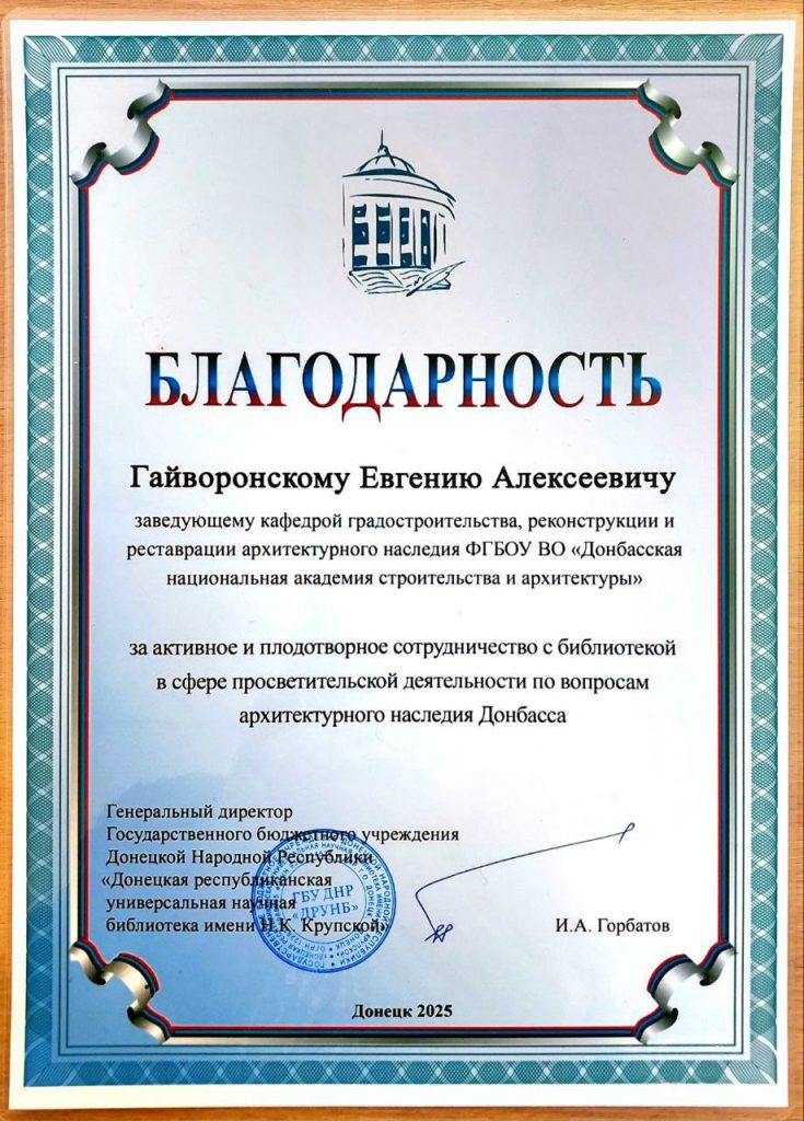 Важно отметить, что Донецкая республиканская универсальная научная библиотека имени Н.К. Крупской (ДРУНБ) уже не впервые предоставляет площадку для подобных встреч. Поэтому за активное и плодотворное сотрудничество с библиотекой в сфере просветительской деятельности по вопросам архитектурного наследия Донбасса Евгению Гайворонскому вручили Благодарность.