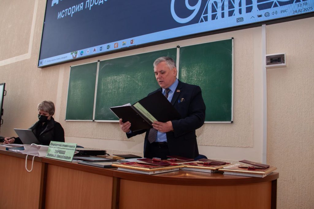 Ректор ДОННАСА Николай Михайлович Зайченко традиционно начал мероприятие с награждения. Он вручил нагрудные знаки победителей престижного конкурса «Золотые Имена Высшей Школы», удостоверения к ним, а также дипломы и сертификаты представителям академии. Почётный президент ДОННАСА, доктор технических наук, профессор Евгений Васильевич Горохов удостоен награды за подготовку научных и педагогических кадров; доктор технических наук, профессор Александр Александрович Петраков отмечен в номинации «За вклад в науку и высшее образование», а доктор технических наук, профессор Валерий Иванович Братчун – в подноминации «Академическое наставничество». Сам Николай Михайлович Зайченко также стал одним из победителей в номинации «За преданность профессии и продолжение традиций российской высшей школы». Все четверо также получили памятное издание «Книга Почёта преподавателей вузов Российской Федерации».