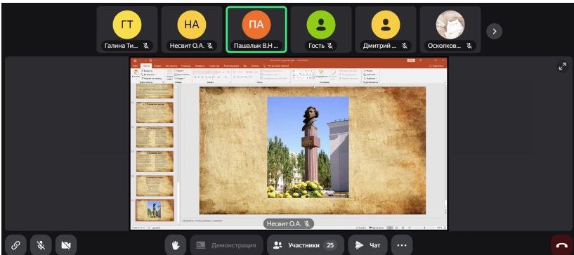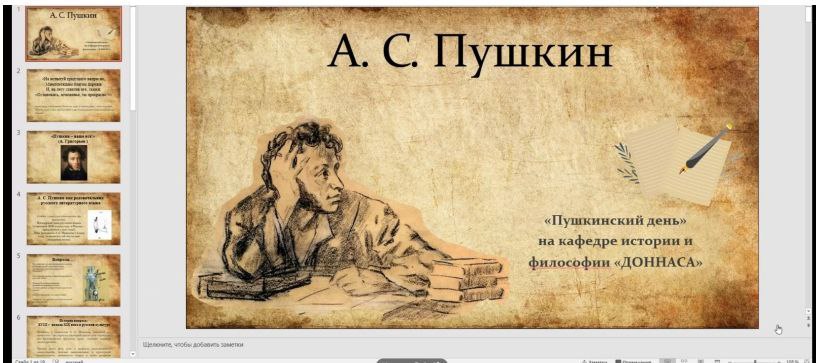 В этом году в преддверии празднования Дня России, на кафедре истории и философии ДОННАСА в рамках работы клуба «Философские встречи» ее руководителем доцентом Полиной Вячеславовной Севериловой был организован телемост «Пушкинские чтения». Эта онлайн-встреча, ставшая уже традиционной, символически объединила два государственных праздника начала июня: Пушкинский день, который также отмечается как Международный день русского языка и День России.