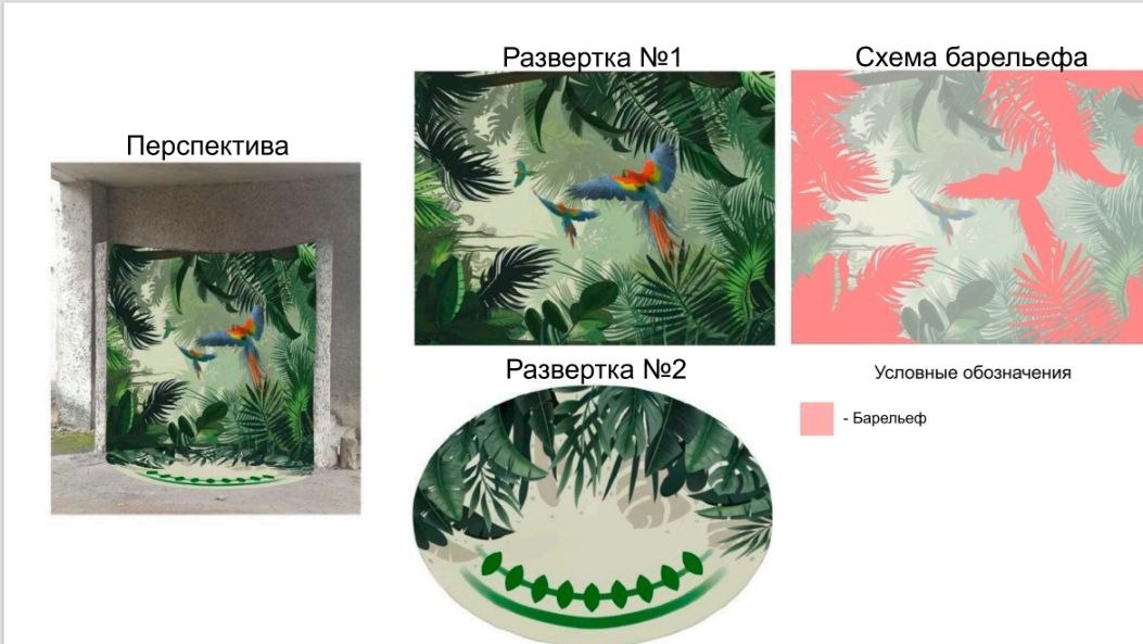 В планах на вторую художественную практику данных групп – живописную – выполнение росписи с барельефом на стене на территории Ботанического сада.