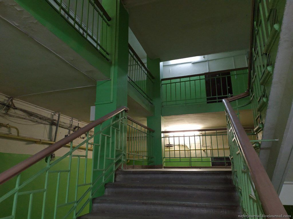 Необычно выглядят в этом здании и лестничные пролёты. Они широкие и оригинально расположены. Несмотря на небольшую этажность, в доме предусмотрели целых два лифта.