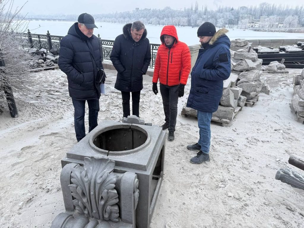Обсуждались вопросы по реставрации и ремонту ОКН «Архитектурный комплекс моста через реку Кальмиус»: оценка степени сохранности чугунных декоративных элементов после их пескоструйной очистки, а также утверждение образцов гранита для реставрации декоративной облицовки.