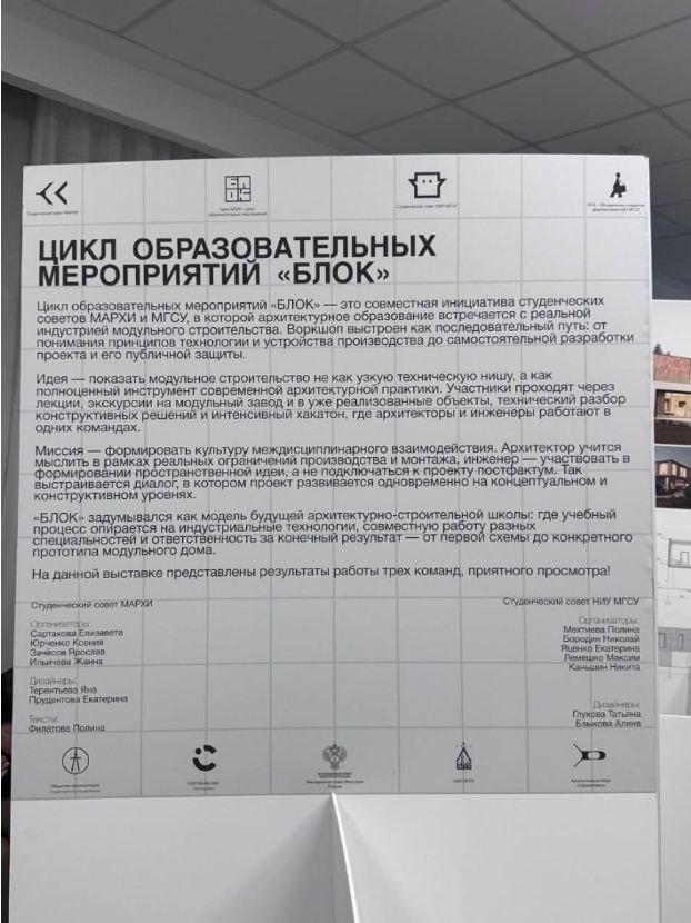 С 9 по 24 февраля 2026 года по совместной инициативе студенческих советов МАРХИ и НИУ МГСУ состоялся цикл образовательных мероприятий «БЛОК», посвященный модульному строительству.