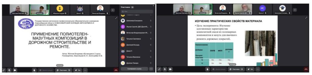 Особый интерес участников вызвал доклад, который подготовил Владимир Алексеевич Желнов на тему «Применение полиэтилен-мазутных композиций в дорожном строительстве и ремонте». Автор сообщил, что в ходе работы были проведены эксперименты по использованию асфальтобетонной смеси с добавлением полиэтилена для ямочного ремонта. Прошла апробация рецептуры на территории колледжа. Установлено, что добавление полиэтилена в смесь приводит к увеличению прочности асфальтобетонной смеси и снижению водопоглощения.