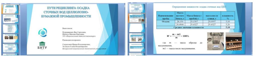 Присутствующие также отметили доклад, представленный сотрудником Белорусского национального технического университета на тему «Пути рециклинга осадка сточных вод целлюлозно-бумажной промышленности». Авторы рассматривают пути рециклинга осадка сточных вод целлюлозно-бумажной промышленности. Проведен анализ физико-химических свойств данного отхода, образующегося на одном из ведущих предприятий ОАО «Добрушская бумажная фабрика «Герой труда». Показана перспективность двух направлений применения осадка: в качестве сорбента нефтепродуктов и компонента технических биогрунтов.