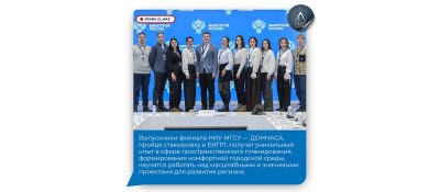 Глава Донецкой Народной Республики Денис Пушилин рассказал о развитии кадрового потенциала ДНР: одиннадцать выпускников филиала НИУ МГСУ — ДОННАСА (https://t.me/donnasa_misi) приступили к стажировке в Едином институте пространственного планирования России в Москве. Об этом глава ДНР сообщил (https://t.me/PushilinDenis/9351) в своём телеграм-канале 💬
